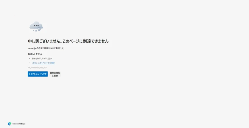 「申し訳ありません。このページに到達できません」「ERR_CONNECTION_TIMED_OUT」などが表示され、サイトにアクセスできない